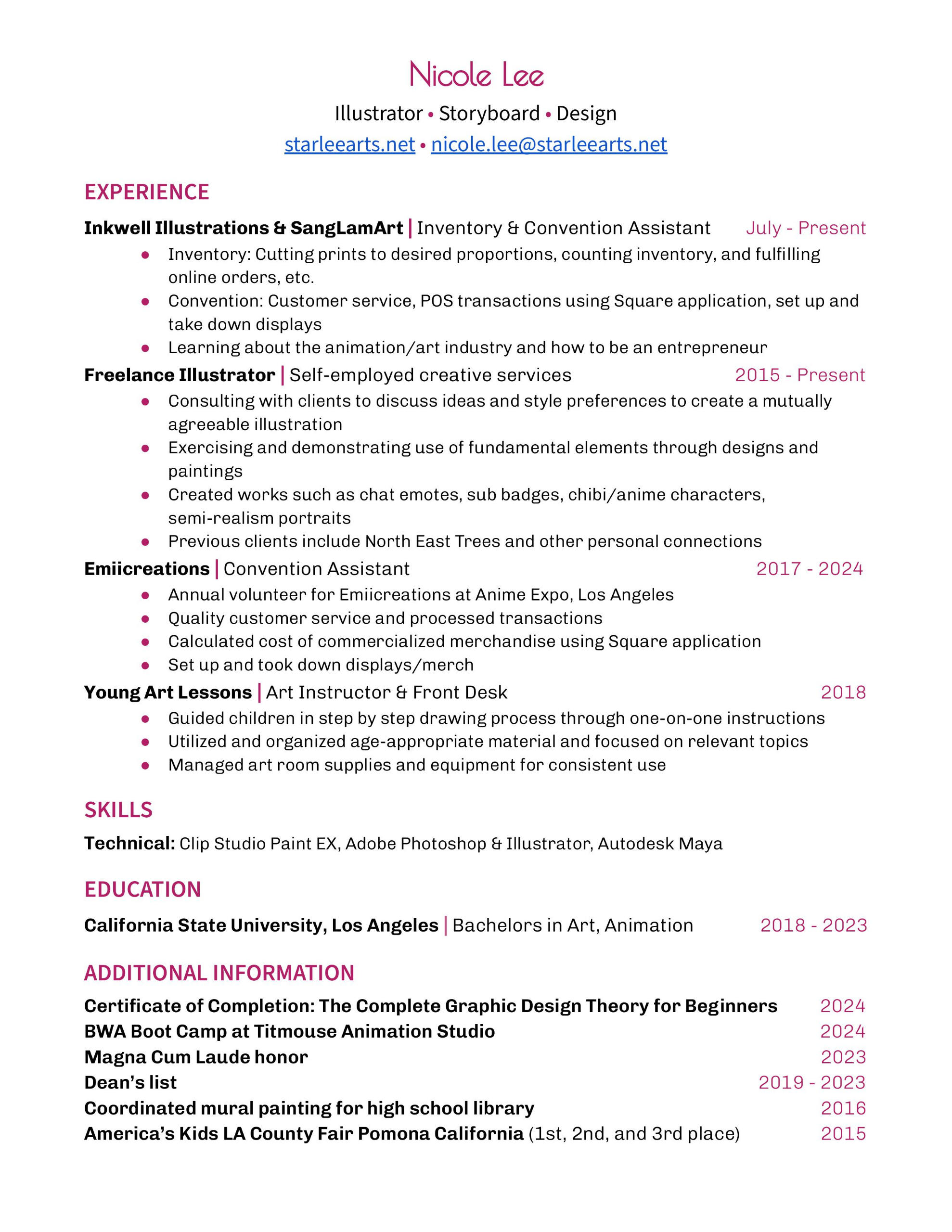 My name is Nicole Lee. I am a gender-fluid (she/her/they), American born Chinese illustrator and storyboard artist based in Southern California.I graduated from CSULA's Bachelor of Arts degree in Animation in 2023. During my time there I achieved the Dean's List from Spring 2019 to 2022, and during graduation I was given the honor of magna cum laude.For experience I have done independent commission work with personal clients, streamer Enna Alouette (NijisanjiEN) as well as from a non-profit organization North East Trees.It would be an honor to work with you on your next project! My passion lies in creating expressive illustrations that harmonize with eloquent storytelling about struggles that individuals go through, whether it is internal or external. Through film/television, I aspire to be the voice that others are unable to have and spread awareness.During my free-time I enjoy streaming and playing games like League of Legends/TFT, Honkai Star Rail, Stardew Valley, and lots more!If you'd like to contact me for work, or any general questions feel free to fill out the contact form, or email me directly!email: [email protected]